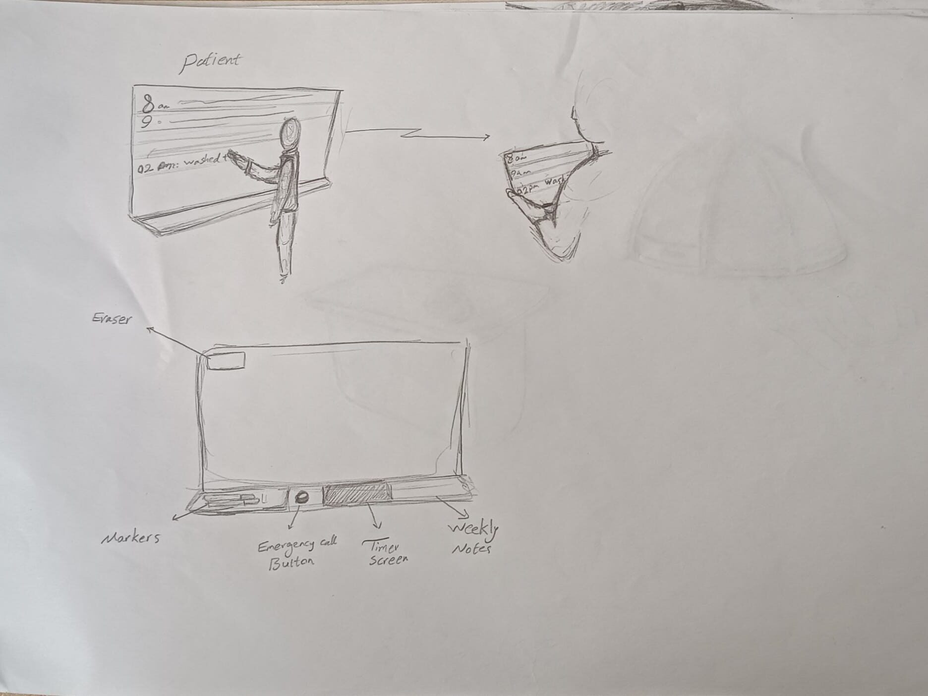 The third idea focuses on allowing and encouraging the patient to complete their daily tasks on their own. This will help them delay the effects of the disease while monitoring them to make sure they are successfully completing the tasks. The design consists of a board that sends everything written on it to another screen, making it easy to monitor the patient. There will be times of the day written on the board and the patient will write what they did onto the board on the corresponding slot. If anything is missed or they forgot to write anything at all, the caretakers can contact the patient and check on them. There is a shelf at the bottom that holds markers to write, an emergency button to contact the caretakers, a speaker and microphone, timer screen- so that the patient or caretakers can set times for tasks,- and notes for long-term reminders.