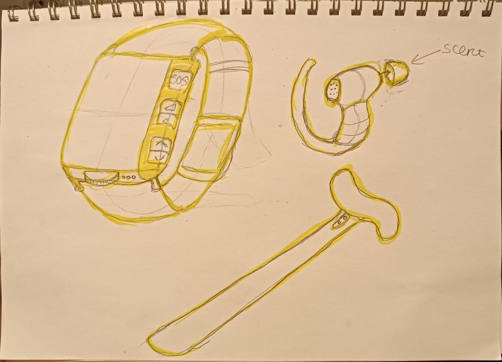 DESIGN IDEA 1: The idea of this smartwatch is, for me, the most valid and practical. With all the features it offers, such as memory support, security, and the ability to display photos that help elderly people remember their family members and past life experiences, it provides great assistance. The SOS button for emergencies is also of vital importance. A brilliant feature is the release of familiar scents for the elderly, which helps stimulate memories and makes them feel at ease. The GPS, like the SOS, is crucial. It could be useful to see if it's possible to link the watch’s GPS to the phones of close relatives, such as children, siblings, or cousins, to always keep track of the elderly person’s movements. Regarding the playback of videos, music, or sounds, it would be nice to add a jack for regular headphones (in case the elderly person doesn't have or doesn’t know how to use Bluetooth headphones). As for the sensor to attach objects, I would like to understand better how it works—specifically, how the objects are attached and how it can help with safety.