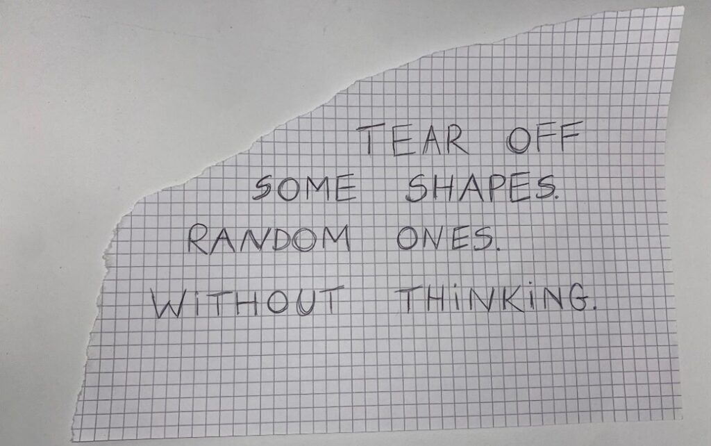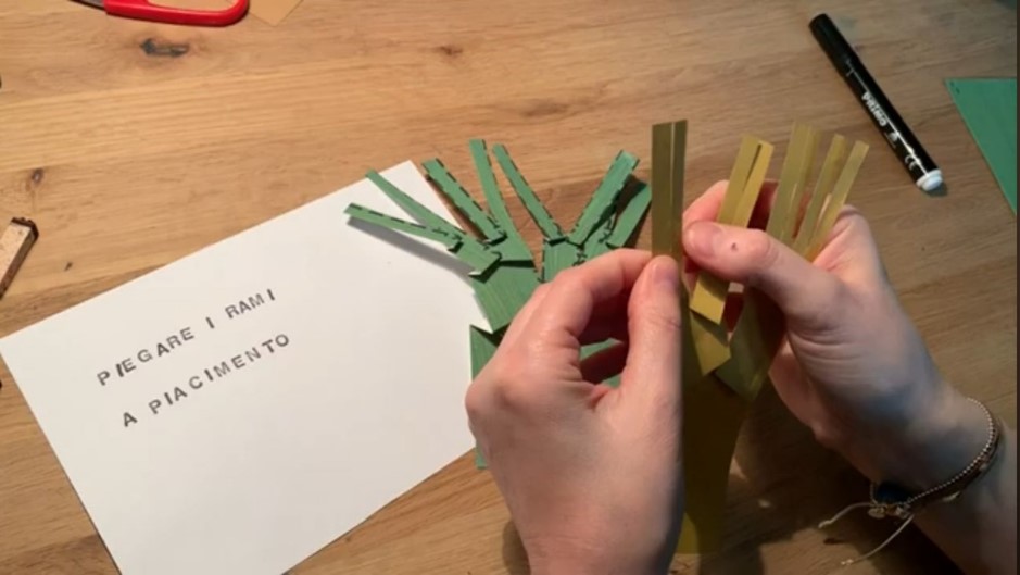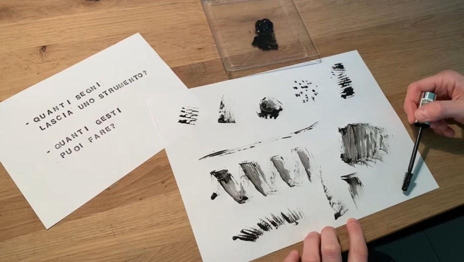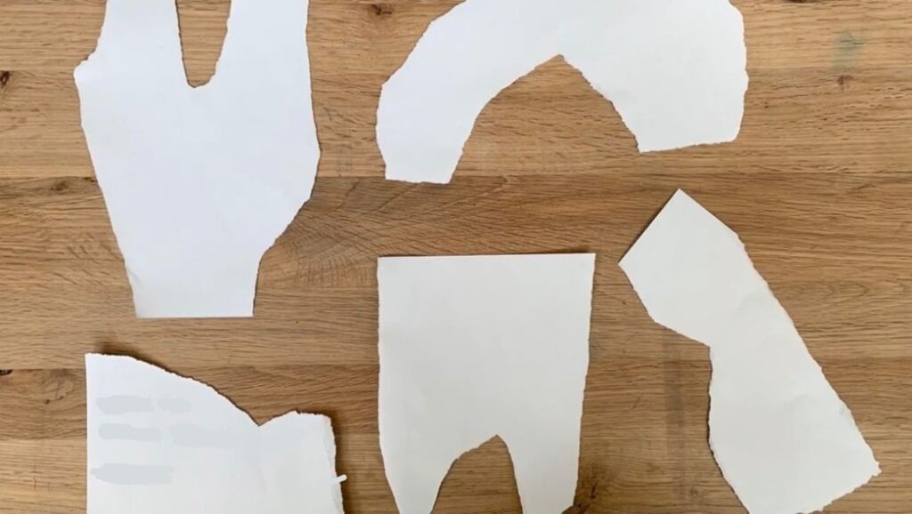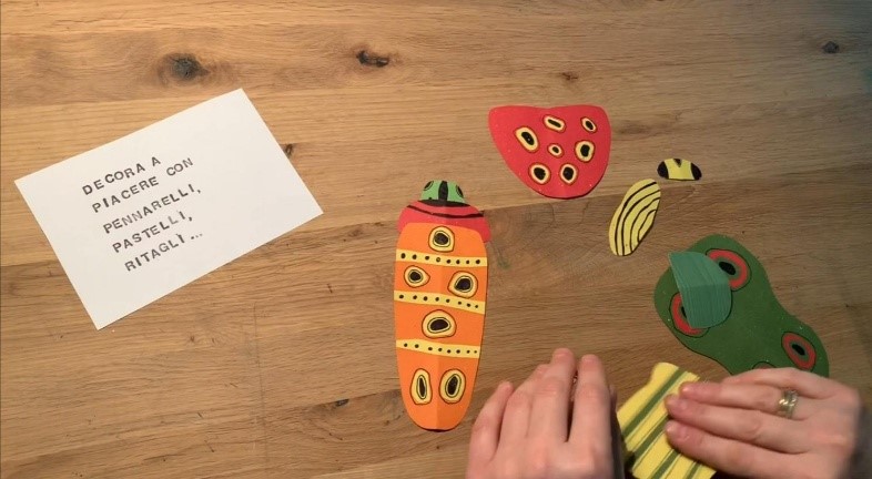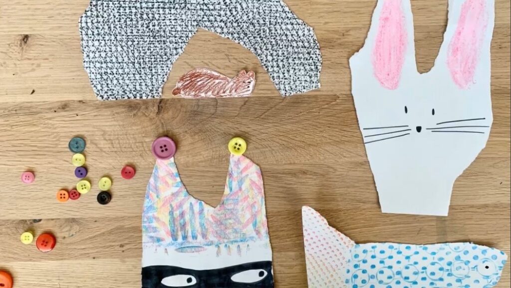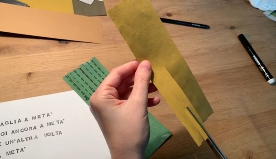 Materials: Strips of paper of different sizes, rounded-tip scissors, scrap paper, upcycled tools such as brushes and sponges of all kinds, tempera paint.