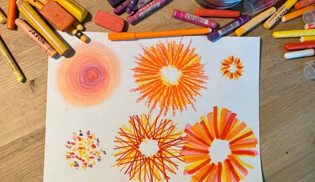 Materials: Crayons, chalk, tempera paints, or wax crayons, paper.
