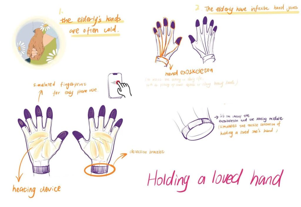 The elderly often have cold, inflexible hand joints. The glove features a built-in heating device and an external simulated fingerprint for easy phone use. Equipped with an exoskeleton, it assists the elderly with daily tasks like picking up small objects or lifting heavy loads. The detection bracelet at the bottom controls the exoskeleton and heating module, while simulating the tactile sensation of holding a loved one’s hand.