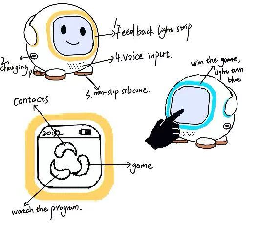Based on the core advantages of the intelligent voice interactive device, wehave constructed the “operation entrance” of the device. We retain thefriendly “rounded shape + soft color” design to avoid a mechanical feelintegrate three core functions: voice control, large-screen interaction, andhealth reminders, supporting voice commands such as “turn on theprojection” and “initiate a family game” to adapt to elderly users with handtremors or decreased eyesight. Meanwhile, we retain safety functionsincluding emergency calls, medication reminders, and fall detection, pairedwith feedback bar light prompts (e.g., flashing for family calls, greenreminders for medication times) to ensure intuitive and easy-to-understandinformation delivery.