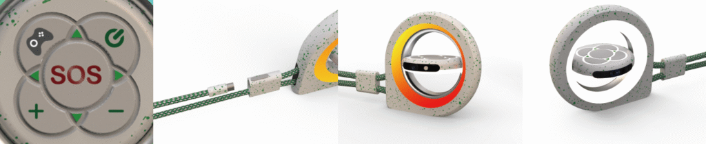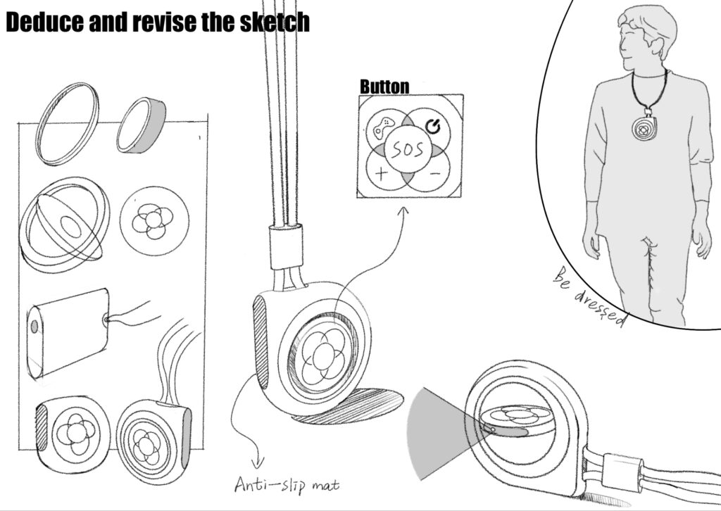 In summary, this necklace is not only a piece of jewelry but also an empowering product for the elderly’s life that integrates “entertainment tool, emotional link, and health assistant”. Through its flexible functional design, it allows the elderly to enjoy convenience while feeling the care and companionship of their families, improving their quality of life and sense of happiness. Its external design adopts the four-petal flower pattern commonly seen on the sidewalks of Barcelona streets.