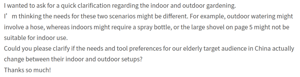 Regarding usage scenarios, we would like to add some supplementary details. In China, some elderly people often convert the yards of old-style houses into small vegetable gardens. For elderly residents living in new residential communities, due to the restriction that they cannot use the community spaces arbitrarily, they choose to grow plants on their balconies. Additionally, there is a group of elderly people living in old residential communities who not only grow plants on their balconies but also make use of the unused spaces or flower beds downstairs in the community for planting. Our target audience is exactly this last group of elderly people, and the problem we need to solve is how to transport tools when they need to take care of plants both upstairs (on the balcony) and downstairs (in the community spaces).