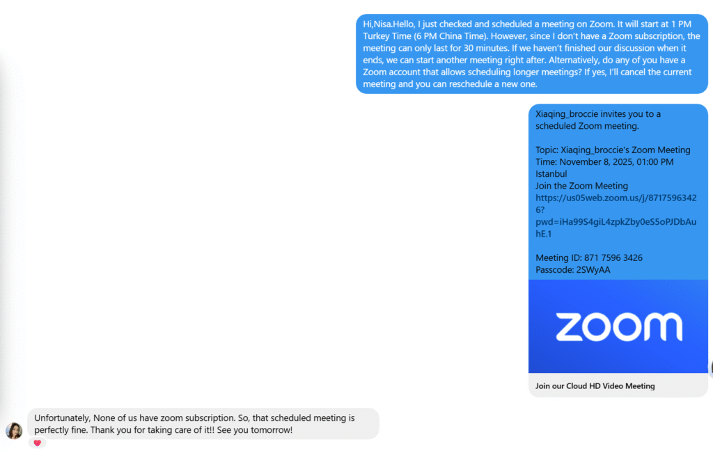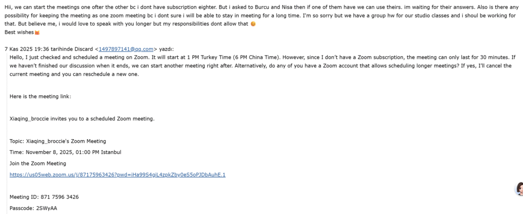Burcu connected with members of our group on WeChat using the contact information provided in our briefing document. She also thoughtfully created a dedicated WeChat group to streamline communication between both parties. Additionally, she inquired about our availability for an online meeting—intended to review the briefing document and enable a brief introductory check-in. As we had classes scheduled on Thursday and Friday, we coordinated via email, WeChat, and Instagram to finalize the meeting details, confirming an online session for Saturday afternoon.