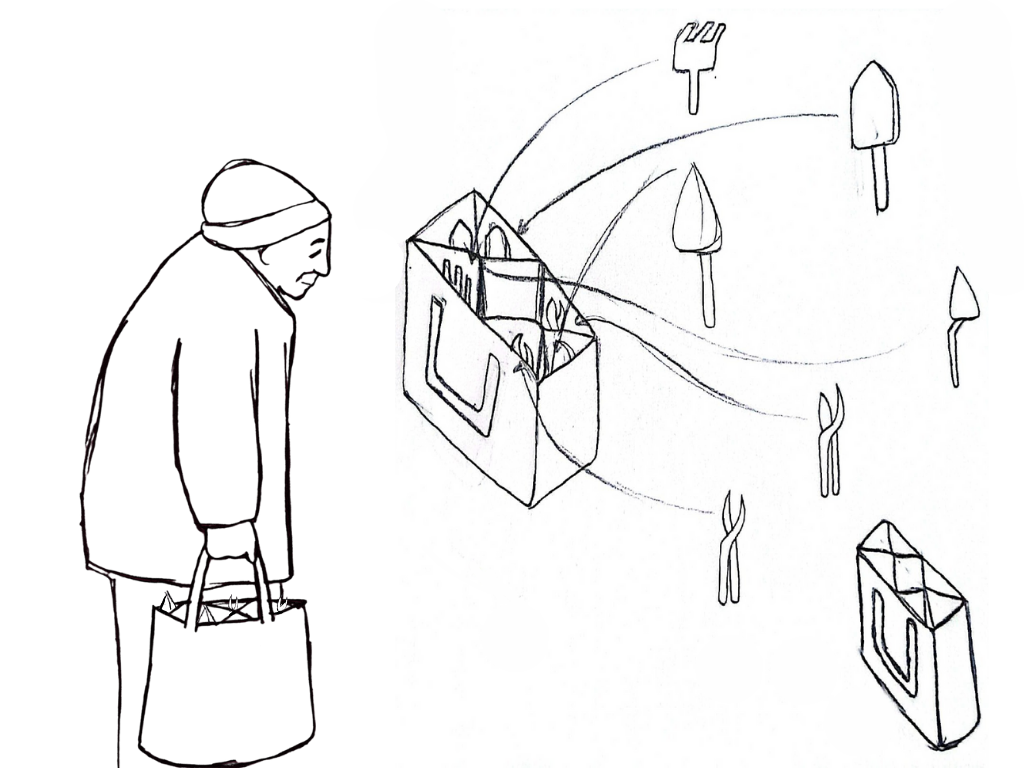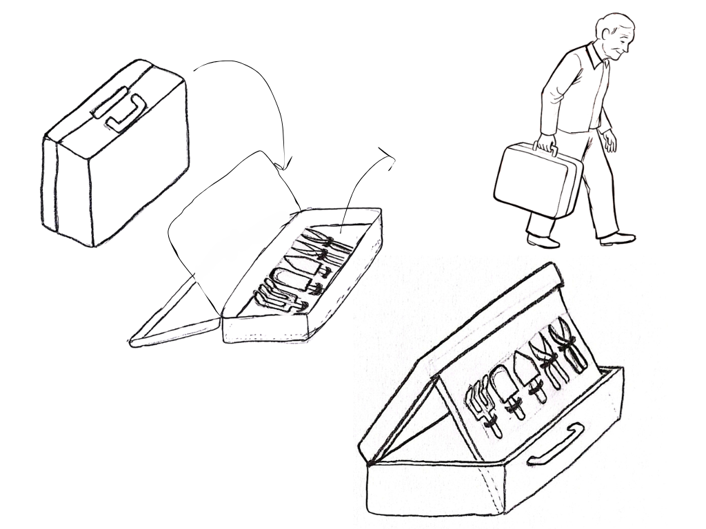 My first idea is a rectangular carrying case, complete with a handle and a lock, designed to resemble a nostalgic suitcase. When opened, one of the interior surfaces—to which the tools are affixed—can be propped up at an angle, resting against the other side of the case. This allows all the tools to be displayed neatly and remain clearly visible on a single plane.
