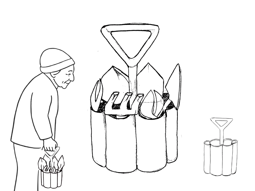 The third design is an open-top product made of plastic. It is constructed from a combination of cylindrical compartments, which effectively keep the tools separate during transport. This solution is ideal for extended use in earthy, wet, or dirty environments, as its plastic material allows it to be washed easily with water.