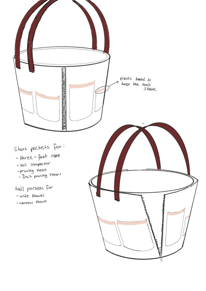 Our solution is a transformable organizer designed to adapt to the user’s preference. The design features a cylindrical body with a vertical zipper expansion system. In its compact mode, it functions as a stable tool carrier. Once the gardening is done, the user simply unzips the gusset to expand the circumference, transforming it into a spacious bag suitable for carrying the harvest or going to the market.