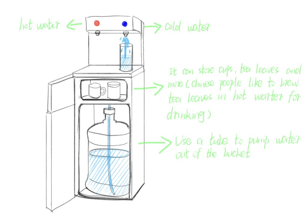 Therefore, I hope you can improve the first design scheme by developing such an intelligent product. When the elderly want to drink water, they only need to press a switch, and the product can automatically pump water from the bucket and let it flow out from the water outlet above. In this way, the elderly can get water without bending down. Additionally, the product should have a water heating function, so that the elderly no longer need to boil water in the traditional way, which can reduce the risk of accidents.